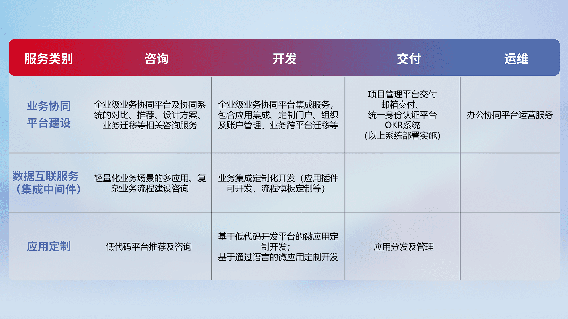 针对钉钉、、、、企微、、、、IDaas等平台级产品提供产品的规划、、方案、、、、交付、、定制化开发等服务,,实现如统一协同办公、、智能客户服务、、混合会议管理、、、、智能数据查询、、、、等业务场景,,实现数字化转型。。